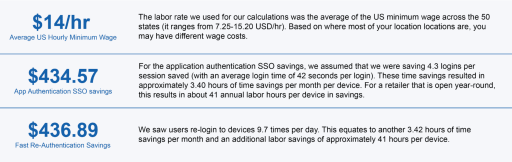 Without single sign-on, those 42.3 seconds add to a yearly loss of hundreds of thousands of dollars in additional support costs and decreased productivity. We’ve found that companies implementing SSO with BlueFletch Enterprise save upwards of $871 per year per device. Over the years, these savings can accumulate as more device fleets adopt SSO as their standard login security protocol.